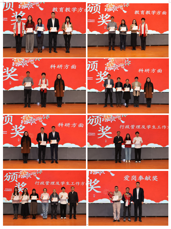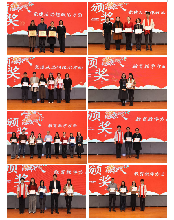 表彰结束后,新春茶话会精彩上演。全体教职工欢聚一堂,共同挥手告别擎满收获的2025,在欢声笑语中迎接充满希望的2026。学院领导班子为党建思政、教育教、科学研究、行政服务及学生工作各类获奖的教师颁发了荣誉证书。