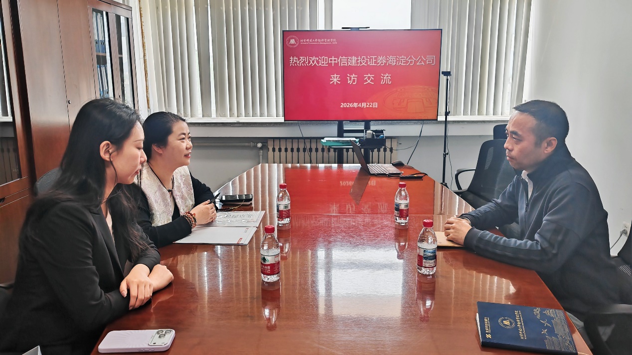 4月22日,中信建投证券北京海淀分公司人力资源负责人丁祎美一行来我院交流,学院党委副书记、副院长刘焱出席座谈。