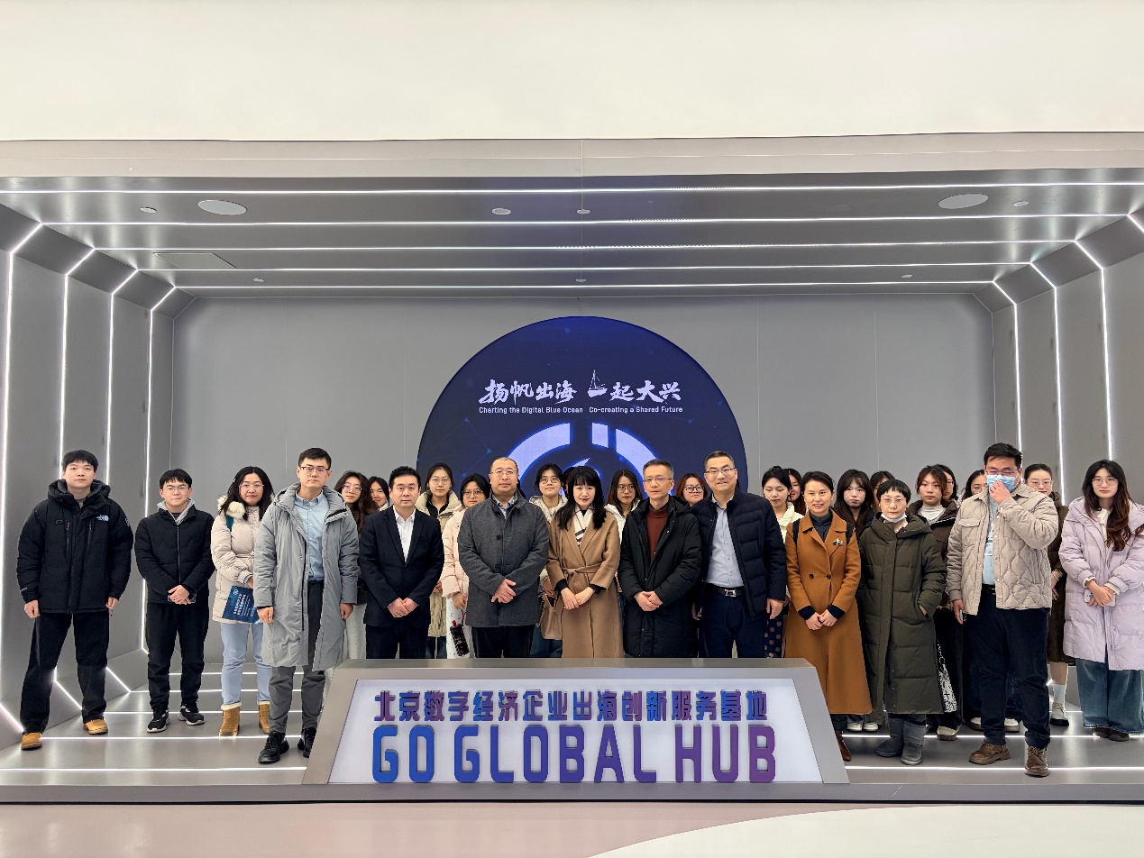 调研首站为北京数字经济企业出海创新服务基地。基地在工业和信息化部指导、北京市经济和信息化局支持下设立,是全国首个聚焦数字经济企业出海的创新服务平台。基地工作人员通过政策解读与案例分析,系统介绍了数字经济企业“走出去”的战略背景、发展趋势及面临的机遇与挑战,重点阐释了基地在政策对接、资源整合、市场服务和风险防控等方面的功能定位,帮助师生加深了对数字经济全球化发展的理解。