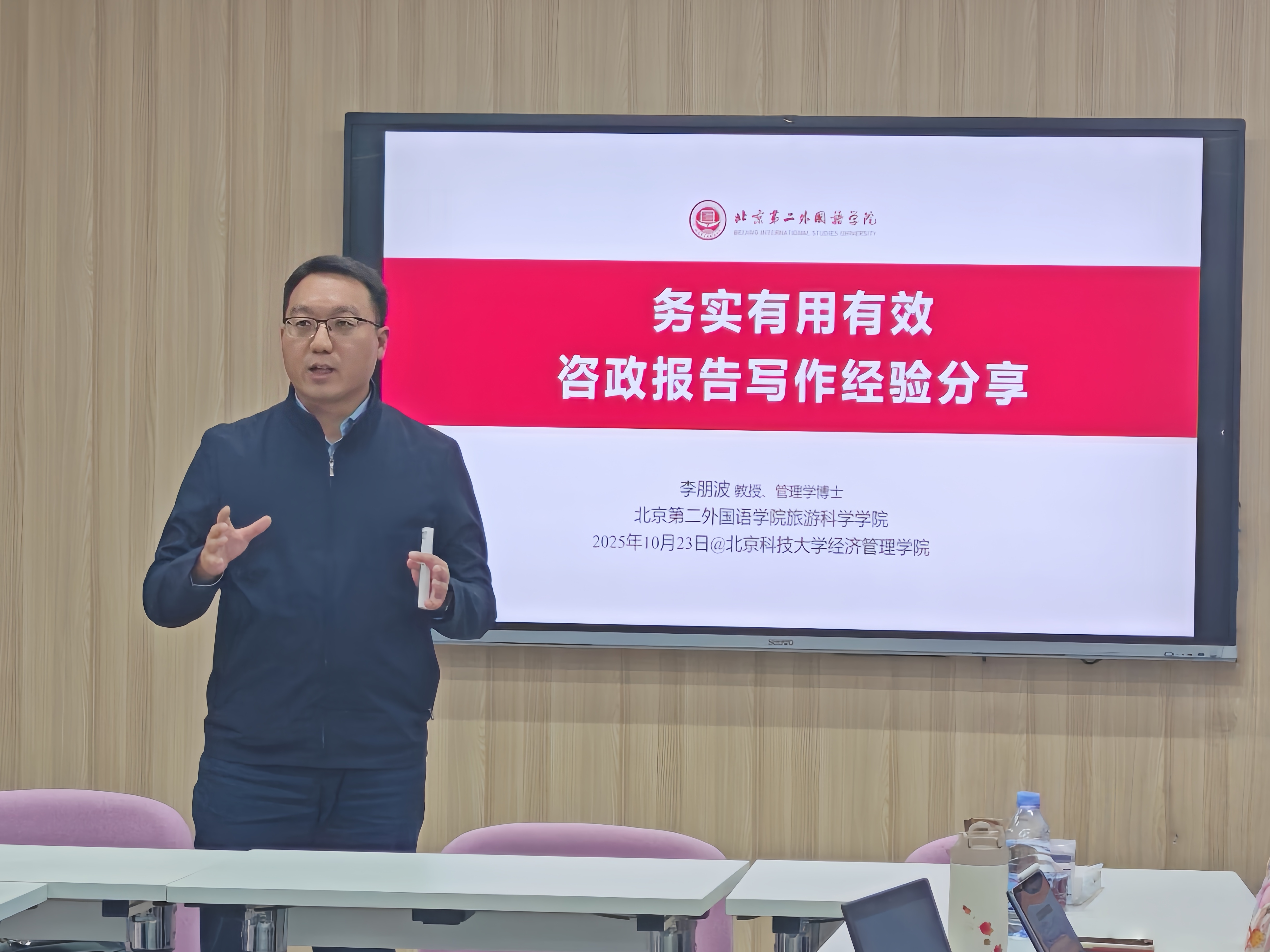 为进一步提升教师与研究生的科研成果转化能力,增强咨政报告撰写的规范性与针对性,北京科技大学经济管理学院工商管理系于2025年10月23日举办“咨政报告写作经验分享”学术讲座。讲座邀请北京第二外国语大学李朋波教授主讲,学院师生共同参加。本次讲座旨在通过专家分享咨政研究与报告撰写的实践经验,促进教师与学生在政策研究、成果转化和社会服务方面的能力提升。