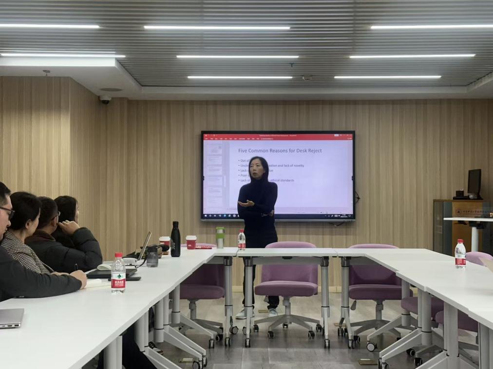 2025年12月12日,北京科技大学经济管理学院工商管理系·期刊编委面对面》系列讲座第四期在经管楼1205举办。讲座特邀 Journal of Product Innovation Management(JPIM)联合主编、佛罗里达州立大学Ruby Lee教授担任主讲。学院多名教师与研究生到场聆听,现场学术氛围浓厚、交流互动充分。