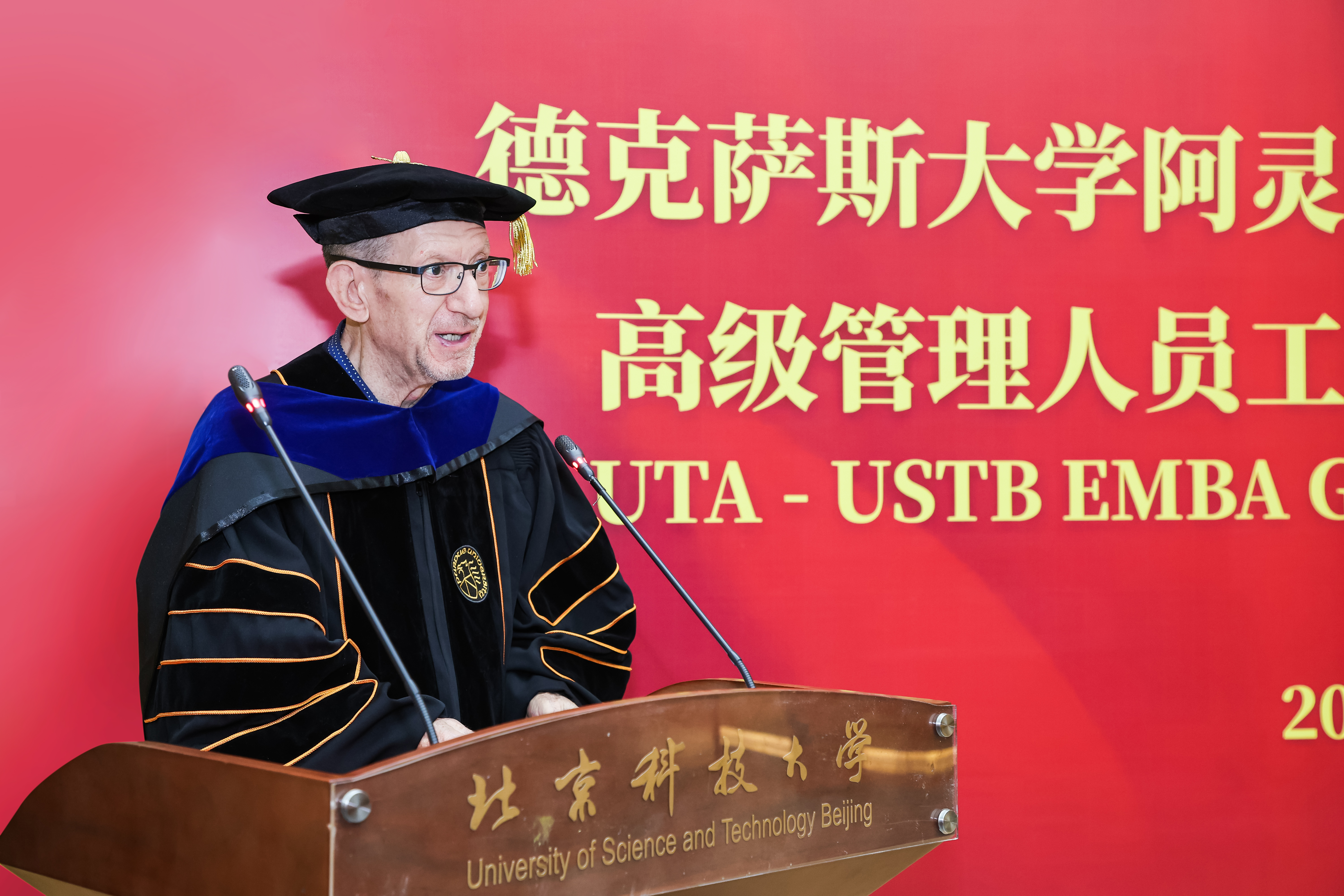 杨仁树向2025届UTA-USTB EMBA毕业生表示热烈祝贺,并向德克萨斯大学阿灵顿分校自2002年至今对学校该学位项目的支持表示衷心感谢。他表示,希望同学们不但要传承学校“求实鼎新”的校训精神、承载经管学院“德性实践,学道创新”的院训精神,更要在未来的生活中胸怀梦想、脚踏实地、行稳致远;希望同学们继续关心支持学校的建设发展,母校永远敞开怀抱,欢迎毕业生回家。